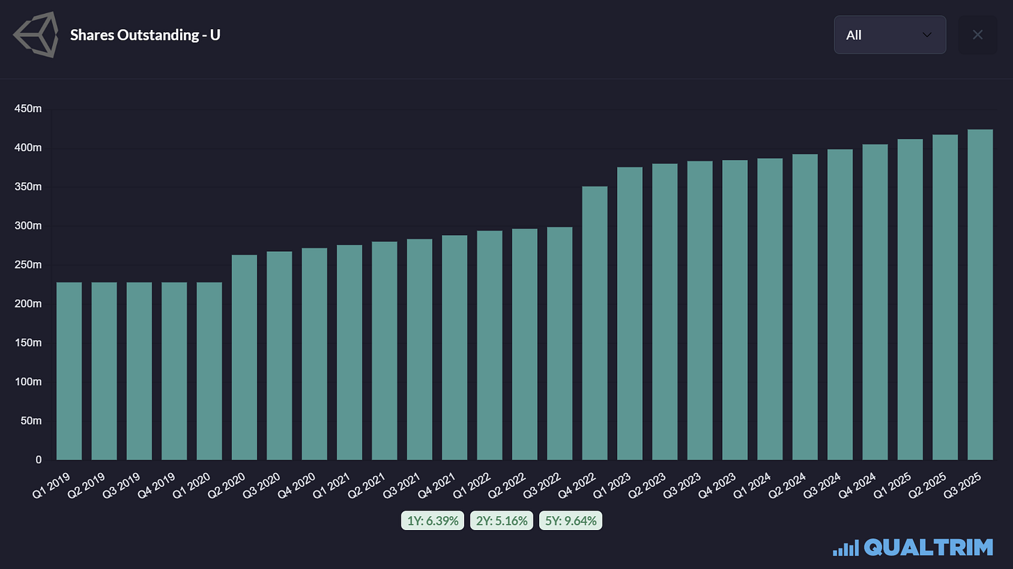 The result of this addiction is massive dilution for you, the shareholder. At the time of its IPO in 2020, Unity had 263 million shares outstanding. As of January 2026, that number is 428 million.