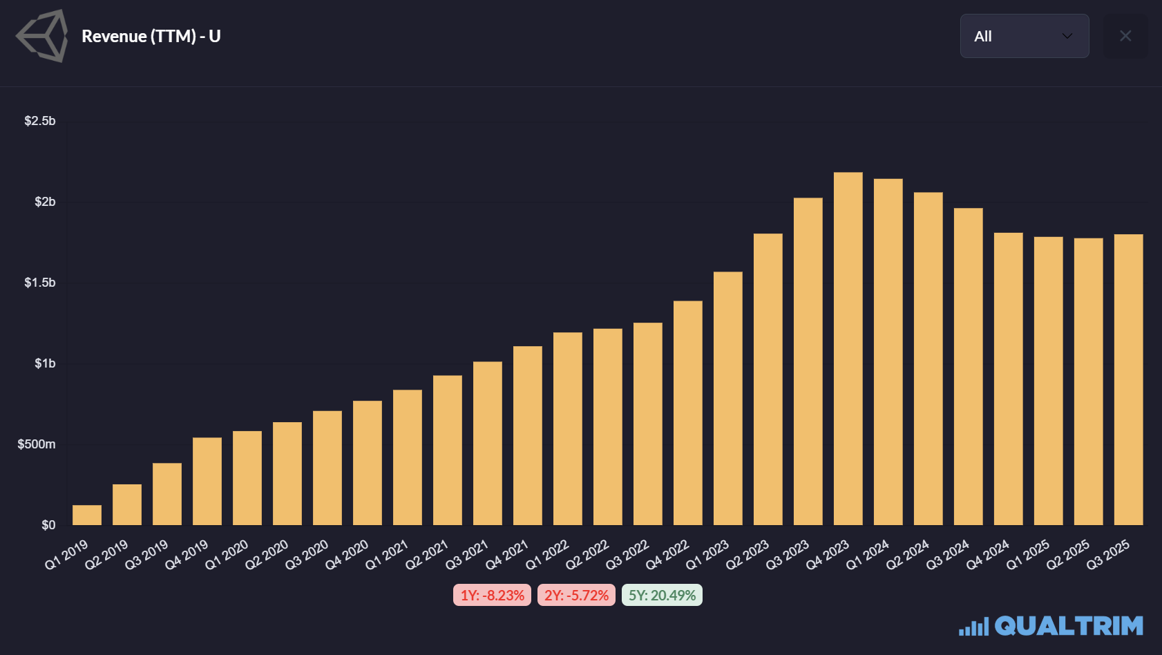 For the twelve months ending 30 September 2025, Unity incurred $515 million in SBC expense. The company’s total revenue over the same period was approximately $1.8 billion.